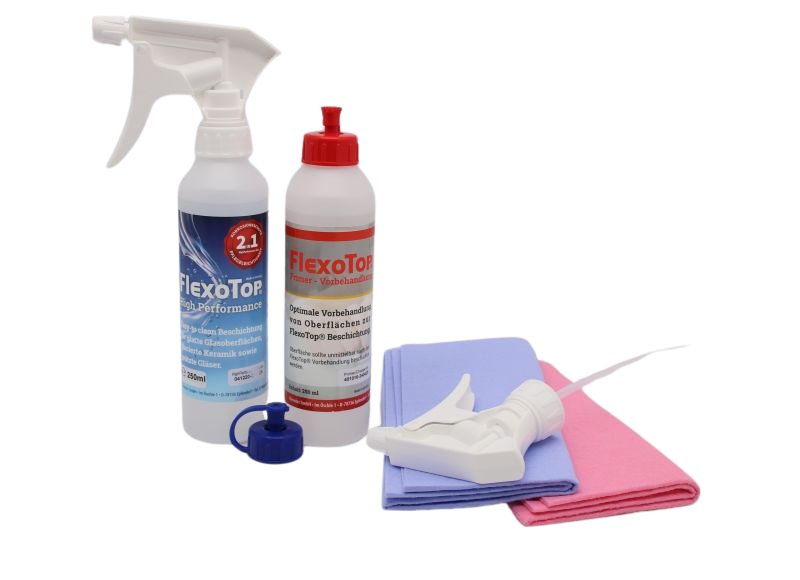 - Versiegelung: Tragen Sie anschließend mit dem blauen Tuch FlexoTop GlasPlus auf. Diese Versiegelung bildet eine widerstandsfähige, hydrophobe Schicht, die Schmutz und Wasser abweist.
