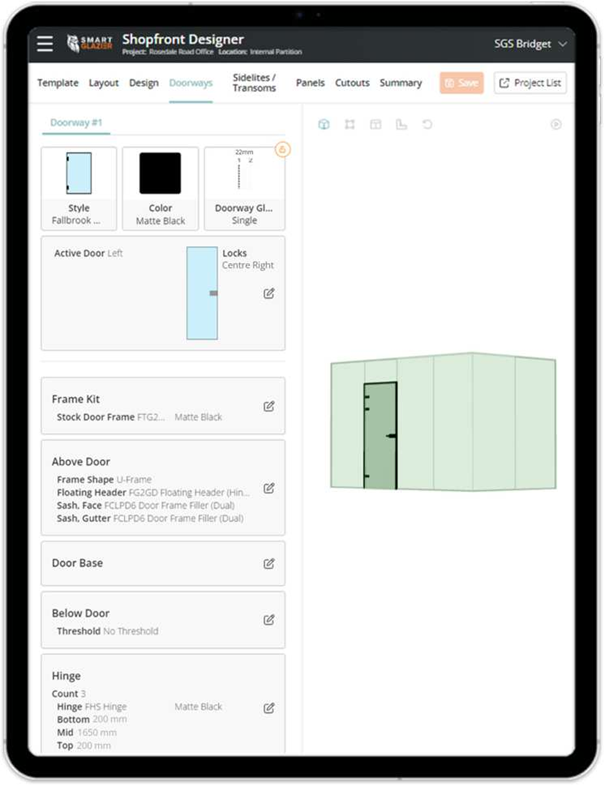 Bieten Sie Ihren Kunden die Möglichkeit, komplexe Schaufenster und Glaswände zu entwerfen. Der benutzerfreundliche Designer für Glaseingänge und Trennwände enthält Ihre ausgewählten Beschläge.