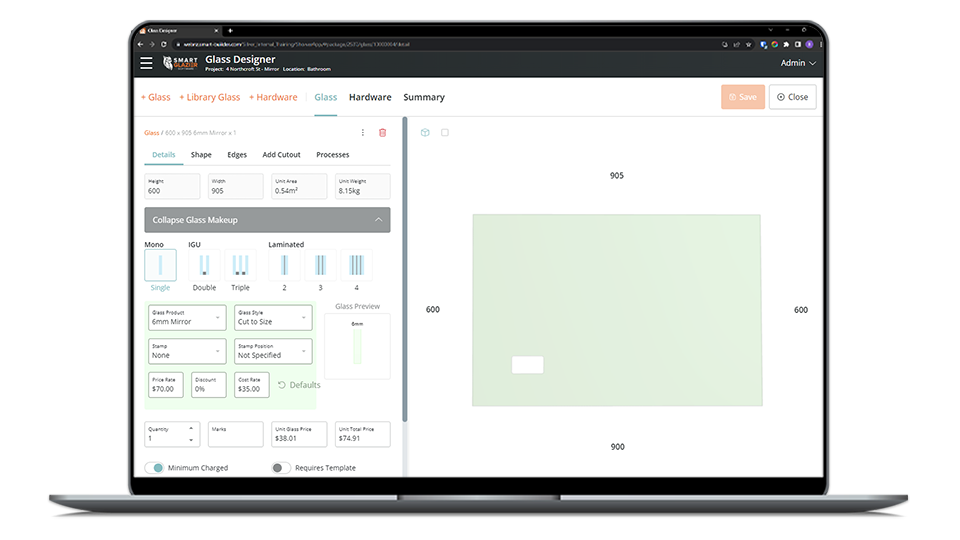 • Ihre Kunden können Glaszuschnitte mit detaillierten Glasbearbeitungen entwerfen, Preise festlegen und Bestellungen aufgeben.