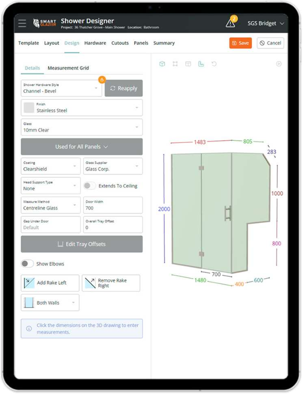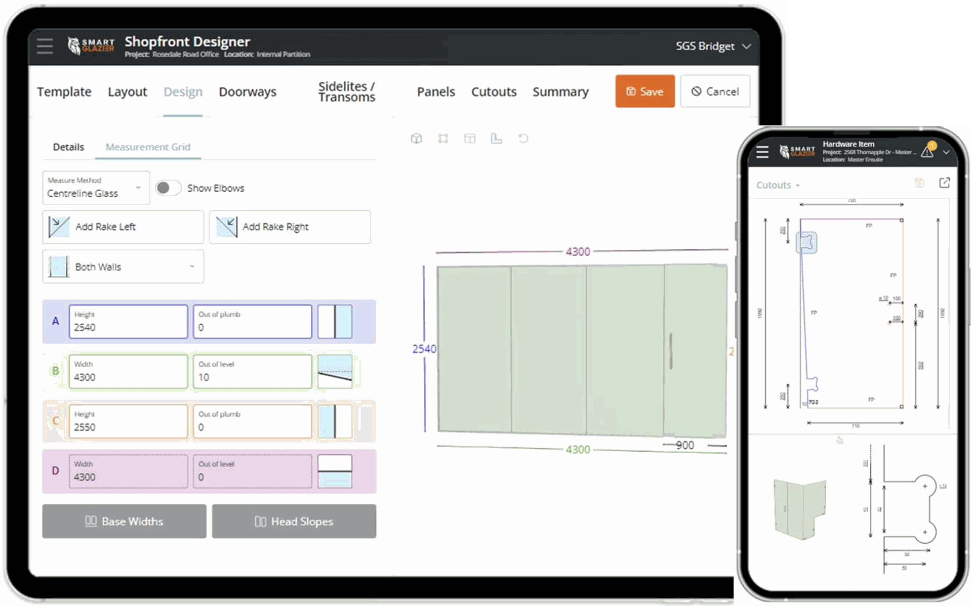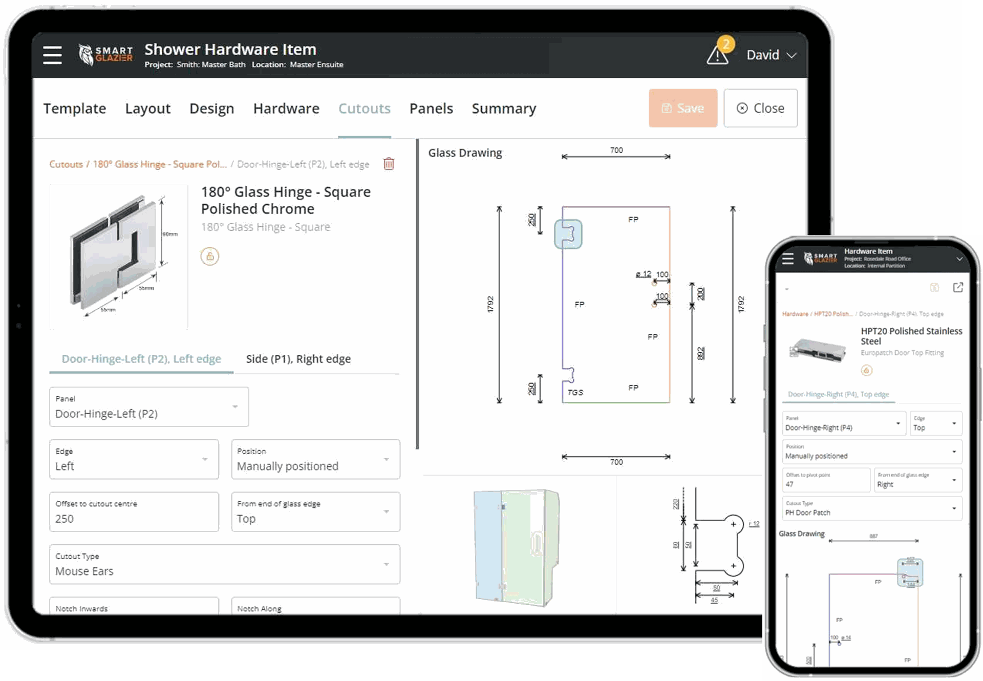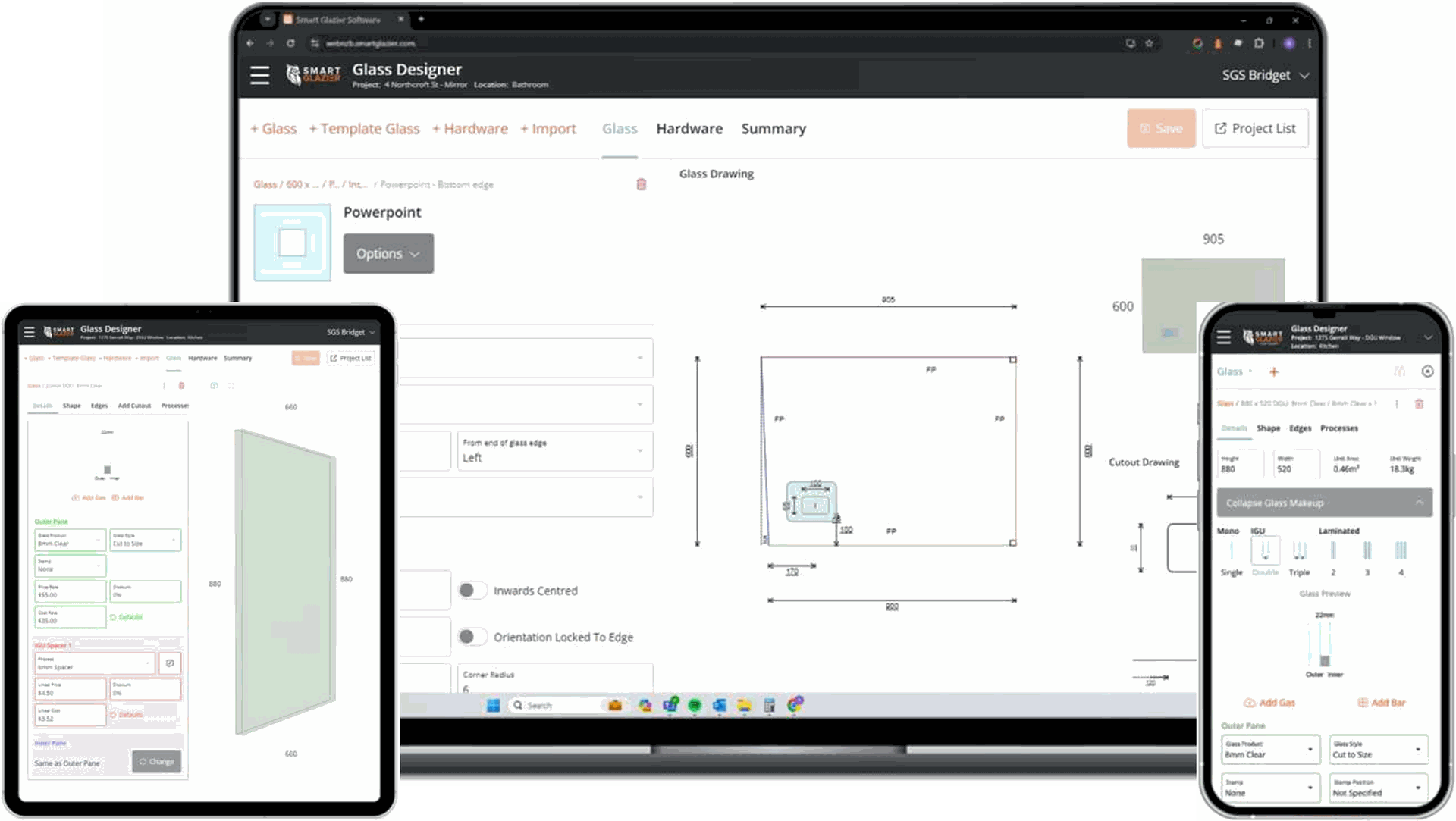 Stellen Sie Ihren Kunden einen benutzerfreundlichen Glas- und Duschdesigner zur Verfügung, den sie auf nahezu jedem Gerät nutzen können. Smart Glazier Connect funktioniert auf Smartphones, Tablets und Computern, sodass Ihre Kunden sowohl im Büro als auch direkt vor Ort Maße eingeben und Projekte entwerfen können.