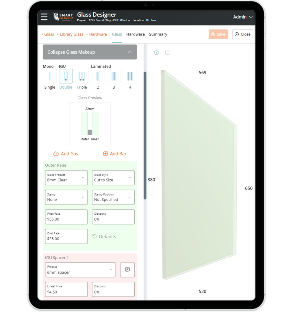 In Smart Glazier Connect können kundenspezifische Preise hinterlegt werden. Während der Kunde entwirft, wird der Preis automatisch im Hintergrund berechnet.
